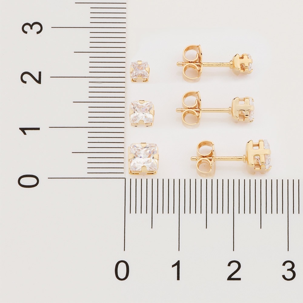 DESCRIÇÃO: Kit brinco solitários com 1 par cravejado por 2 zircônias carrês de 5x5mm, 1 par com 2 zircônias carrês de 4x4mm e 1 par com 2 zircônias carrês de 3x3mm.